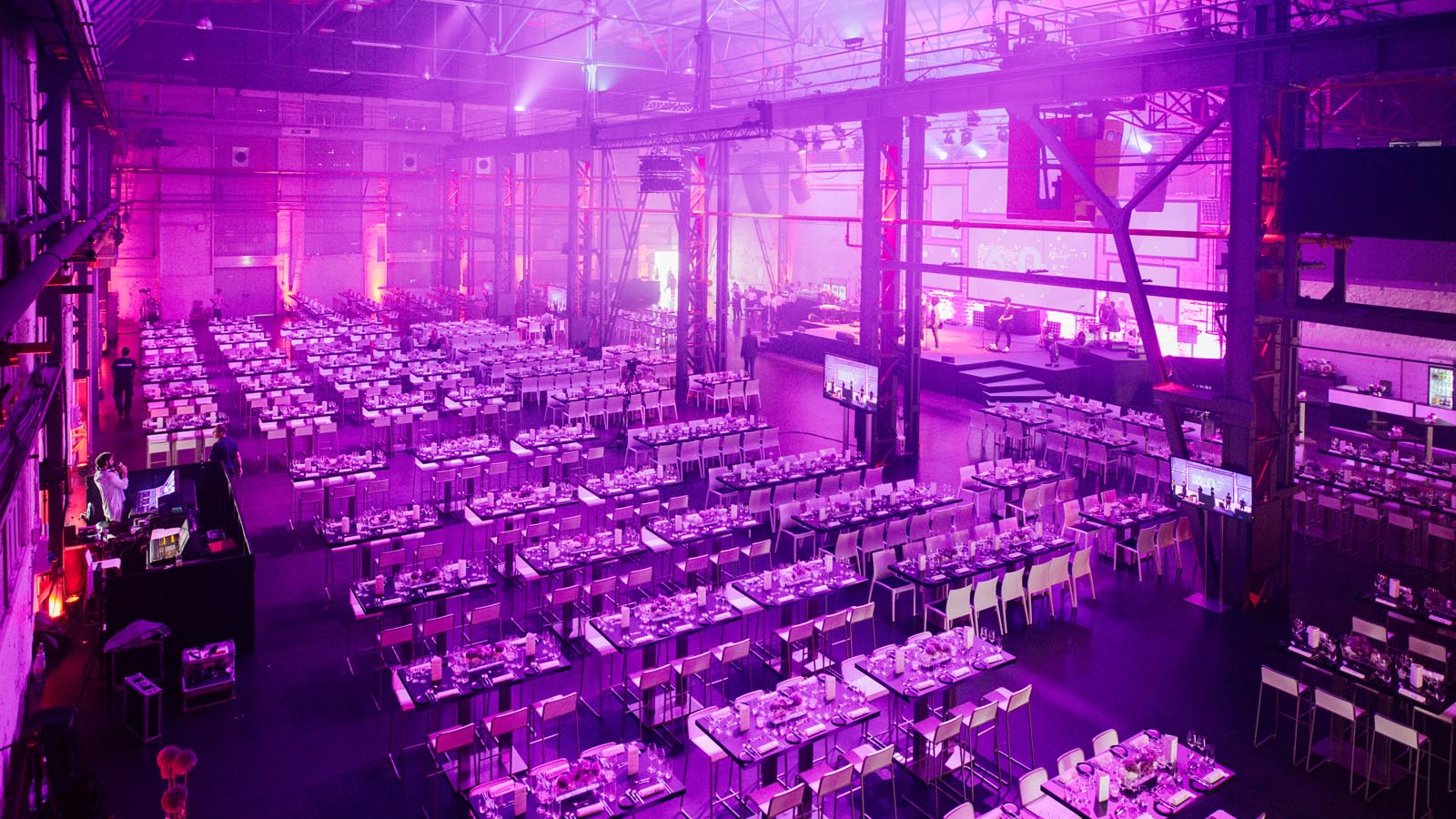 Die Haupthalle lieferte dann den einzigartigen Kontrast zum Empfangsbereich. Auch hier wurde die Unternehmensfarbe „Purple“ aufgegriffen, jedoch in einem dunklen Ambiente auf außergewöhnliche Weise zur Geltung gebracht. So entstand eine ideale Kulisse für die Inszenierungen, die im Rahmen der Abendveranstaltung stattfanden. Vergangenheit, Gegenwart und Zukunft verschmolzen an diesem Abend zu einer unerwarteten Einheit.